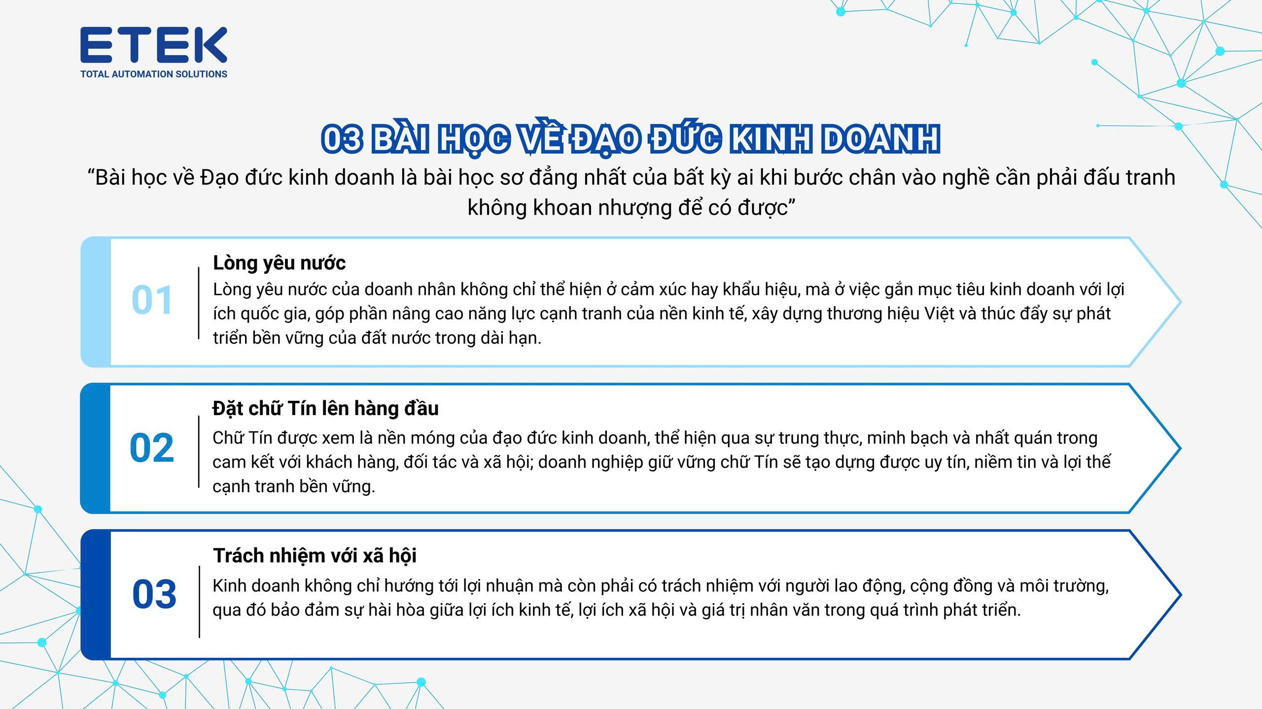 Từ bài học của những doanh nghiệp lớn, ETEK lựa chọn chữ “Tín” làm kim chỉ nam trong mọi hoạt động:
